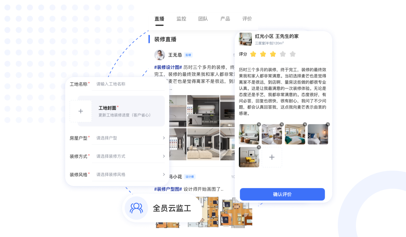 工地實(shí)時(shí)監(jiān)控直播,業(yè)主足不出戶(hù),實(shí)時(shí)觀(guān)看裝修現(xiàn)場(chǎng),工地圖文,視頻,VR全景實(shí)時(shí)更新,保證裝修進(jìn)度。