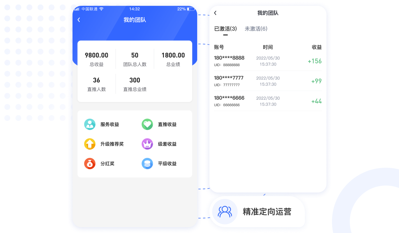 用戶(hù)激活收益,團(tuán)隊(duì)推薦獎(jiǎng),團(tuán)隊(duì)極差收益,快速裂變用戶(hù)