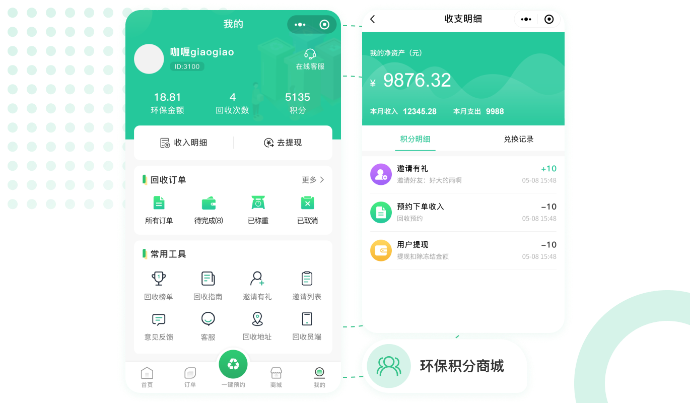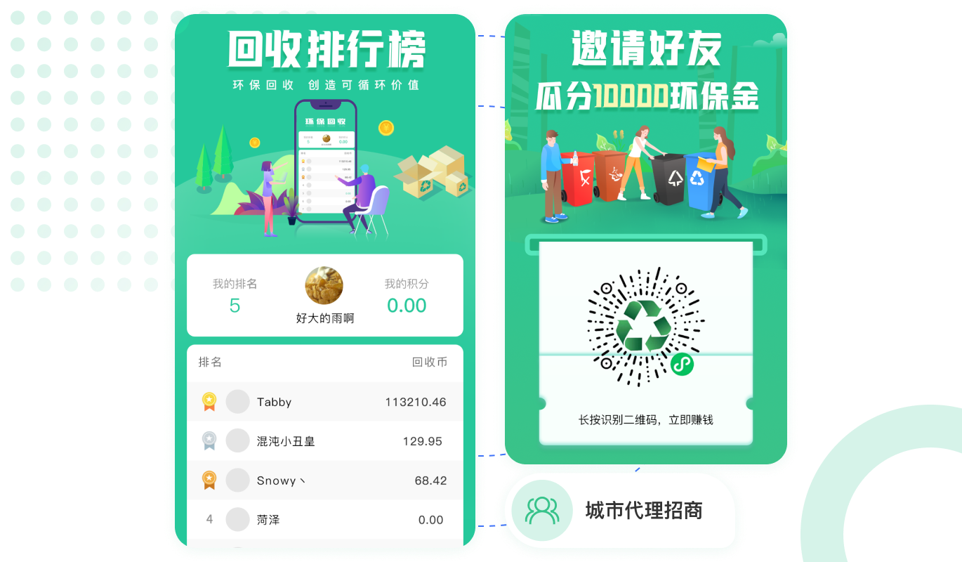 用戶(hù)出售垃圾廢品換錢(qián)的同時(shí)享受積分,積分可以?xún)稉Q商品,增加用戶(hù)的使用黏性。
