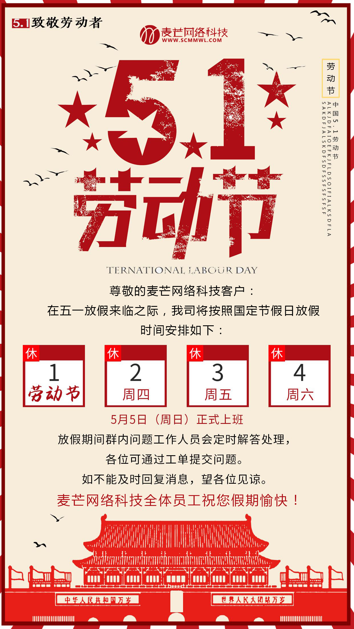 2、2019年5月5日(星期日)正常上班。