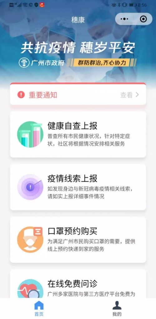 廣州市政府上線了"穗康"小程序,支持重要通知發(fā)布、健康自查上報(bào)、疫情線索上報(bào)、口罩預(yù)約購買、在線免費(fèi)問診等幾個(gè)模塊。