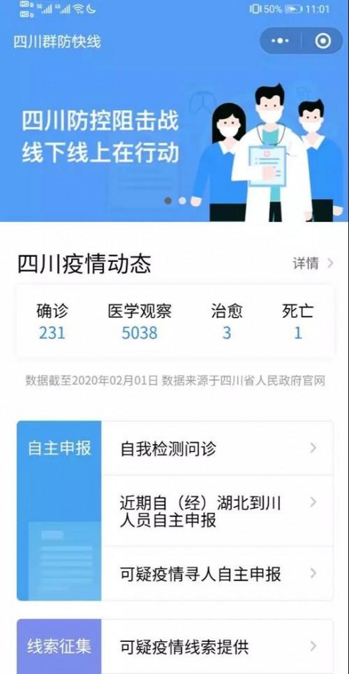 2月3日,四川迅速上線了"四川群防快線平臺(tái)",提供個(gè)人疫情防控信息自主申報(bào)、在線自我檢測、專家視頻問診、可疑疫情線索上報(bào)、權(quán)威信息發(fā)布、違反防控規(guī)定行為舉報(bào)等在線服務(wù)。