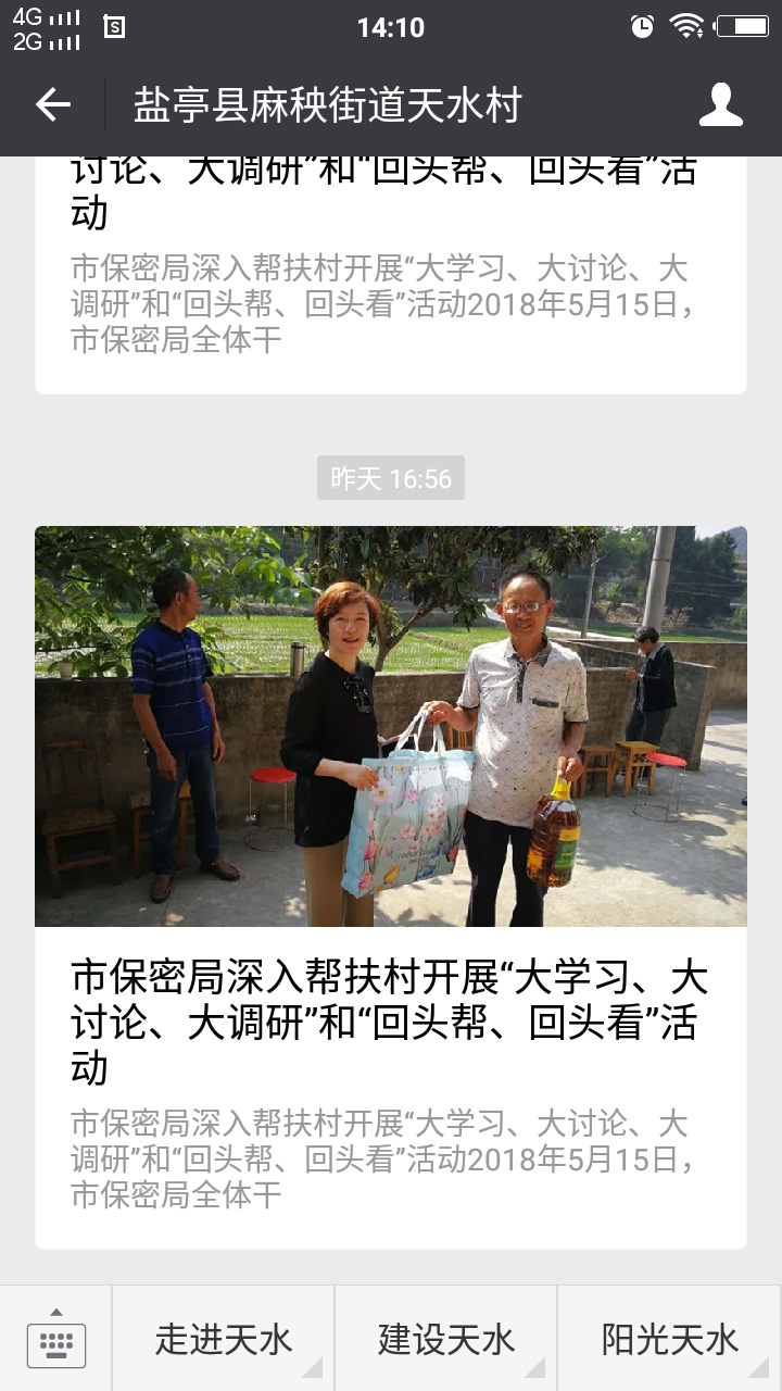 全村幅員面積3.4平方公里,耕地943畝、林地2950畝。轄9個(gè)村民小組,2017年底,共有426戶1057人。2014年被確定為省定貧困村,全村建檔立卡貧困戶63戶151人,貧困發(fā)生率達(dá)14.3%。2014年至今,在綿陽(yáng)市環(huán)境保護(hù)局、綿陽(yáng)市保密局、鹽亭縣環(huán)境保護(hù)局等部門的對(duì)口幫扶下,天水村聚焦“算得攏的收入、看得到的變化、靠得住的保障、掙得到的能力、信得過(guò)的認(rèn)可”分戶施策,精準(zhǔn)發(fā)力,充分運(yùn)用好各項(xiàng)扶持政策,按照“六個(gè)精準(zhǔn)”“五個(gè)一批”的總體要求,圍繞“一水二路三產(chǎn)業(yè)”的脫貧思路,在基礎(chǔ)設(shè)施建設(shè)、產(chǎn)業(yè)發(fā)展、公共配套設(shè)施的提檔升級(jí),在群眾增收上找路子,在產(chǎn)業(yè)發(fā)展中求突破,措施得力,成效明顯,2017年底成功摘帽,實(shí)現(xiàn)整村脫貧。